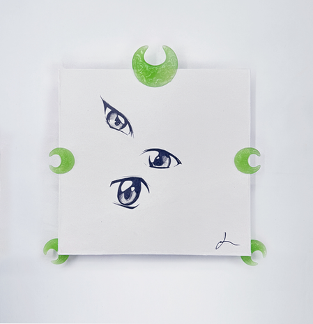 The works also feature eyes as a recurring motif, as both the fundamental portal into the self and as iconic emblems of the anime aesthetic, they manifest in the haphazard style of absent-minded doodles, sketched out whilst daydreaming. Partly drawn by hand and partly rendered by AI they further reflect upon the artificial vs the authentic, considering the validity of virtual experiences, memories and selves.